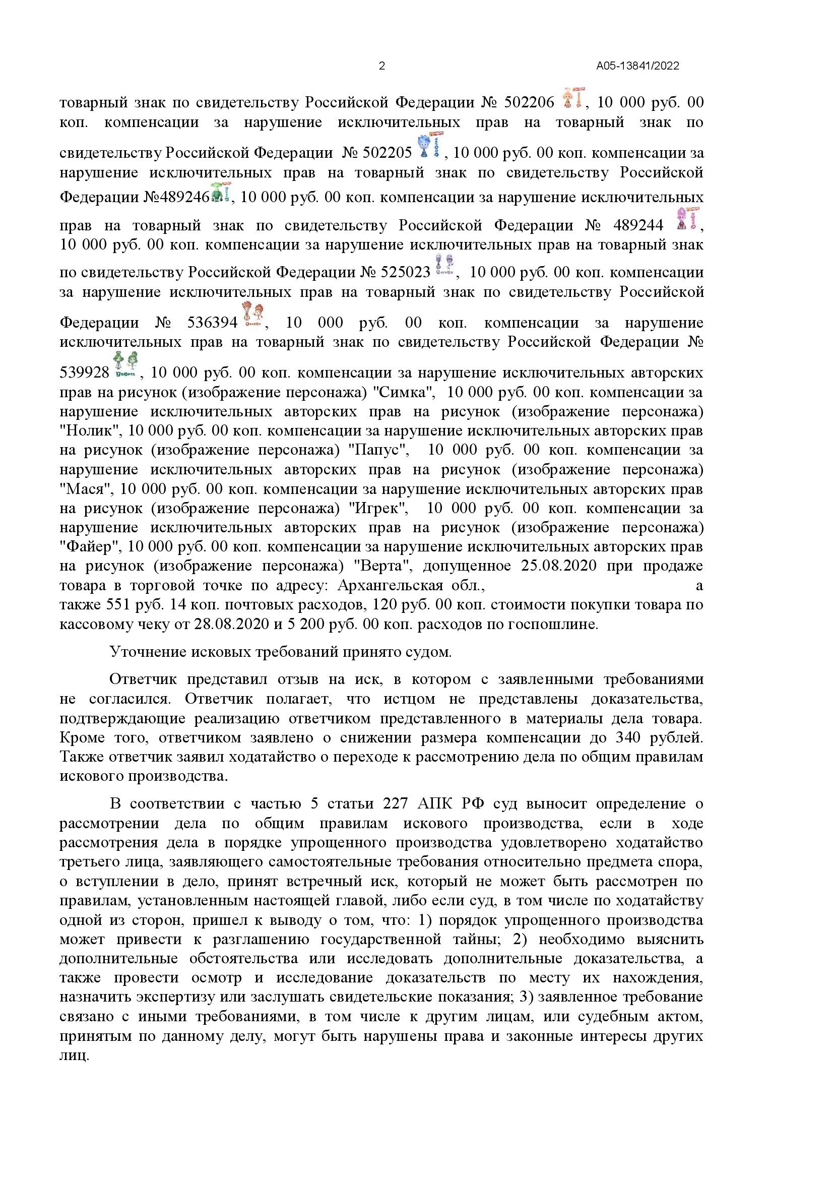 АО «Аэроплан» обратилась в Арбитражный суд г. Архангельска с иском к Индивидуальному предпринимателю с требованием о взыскании компенсации за нарушение исключительных прав на изображение произведения изобразительного искусства - героев мультфильма «Фиксики» в сумме 140 000 руб. Была произведена контрольная закупка пластикового конструктора в картонной упаковке на сумму 120 рублей.